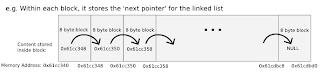 The memory blocks within each chunk are maintained as a linked list so that when the pool memory allocator need to allocate/deallocate memory, it just need to return a free memory block from the list/add it back to the linked list. The memory within each memory blocks is used to store the ‘next pointer’ for the next free memory block in the linked list so that we do not need to allocate extra memory to keep track of the linked list (this approach is learnt from Game Engine Architecture):